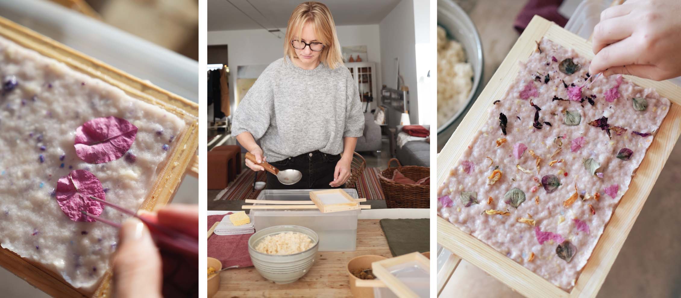 Stap voor stap doorloop je het volledige proces: van gerecycleerd papier tot pulp en van het toevoegen van bloemen en zaden tot het scheppen van je eigen papier. Er is ruimte om te experimenteren met verschillende combinaties, composities en hoeveelheden, zodat je voelt wat werkt en wat je mooi vindt. De nadruk ligt op vrij werken, aandacht voor materiaal en het plezier van het maken.